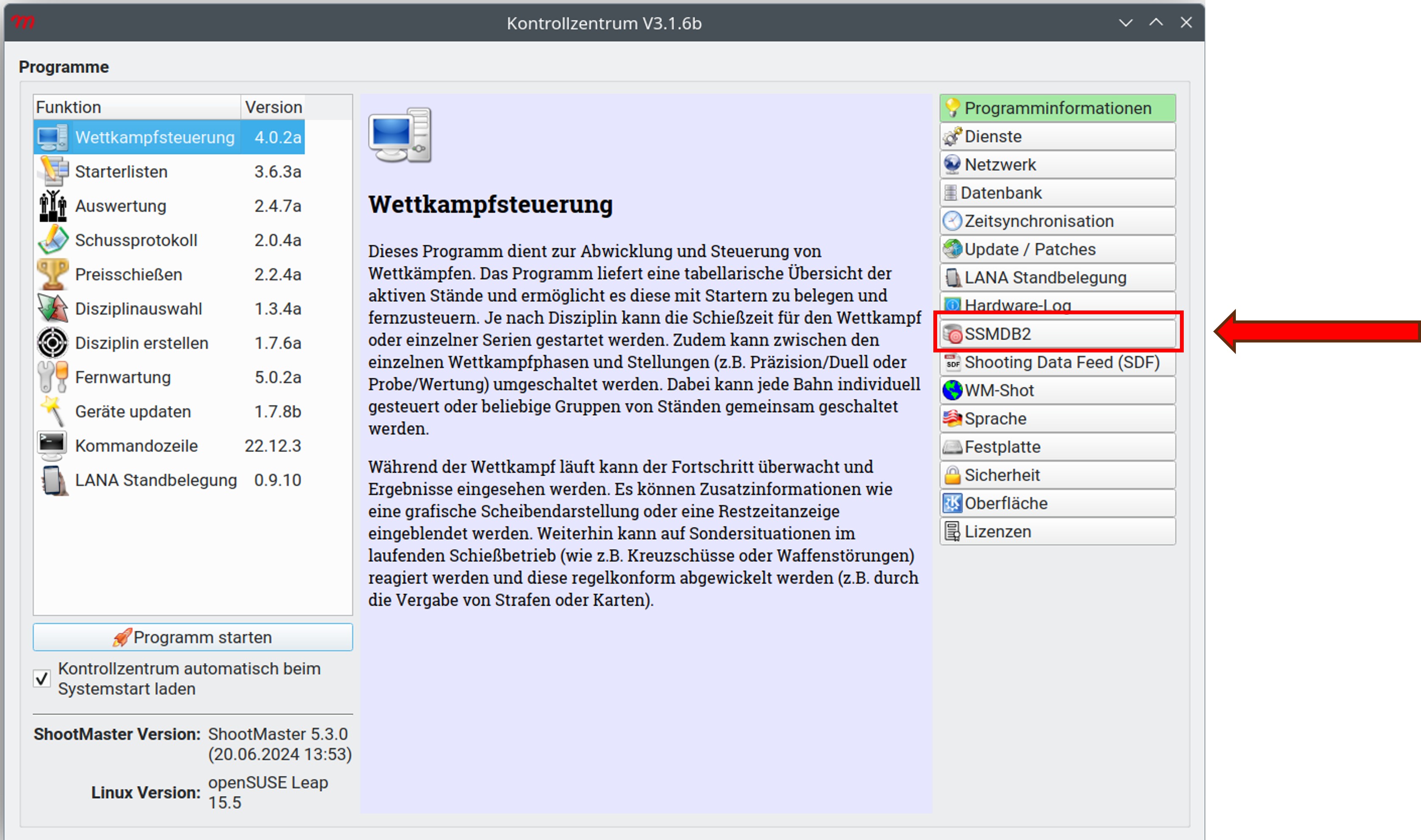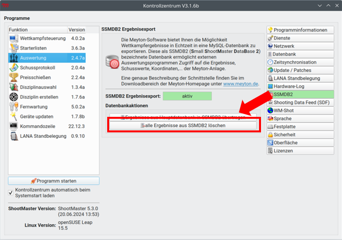 Den PC starten und mit dem Benutzer Otto und Passwort Otto anmelden. Das Shootmaster Kontrollzentrum startet automatisch. Die SSMDB2 Datenbank muss vor jedem Kampf zurückgesetzt werden. Hierfür im Kontrollzentrum einmal auf SSMDB2 klicken. Es müssen alle Ergebnisse aus der SSMDB2 gelöscht werden.