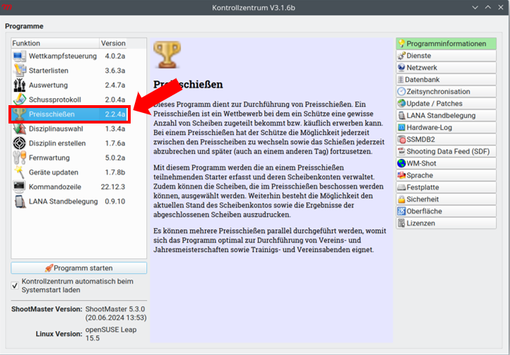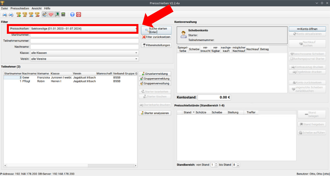 Das Kontrollzentrum öffnen und das Preisschießen mit einem Doppelklick starten. Es öffnet sich eine Anmeldemaske. Hier mit dem Benutzer Otto und Passwort Otto anmelden