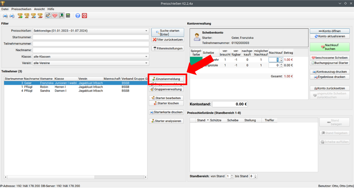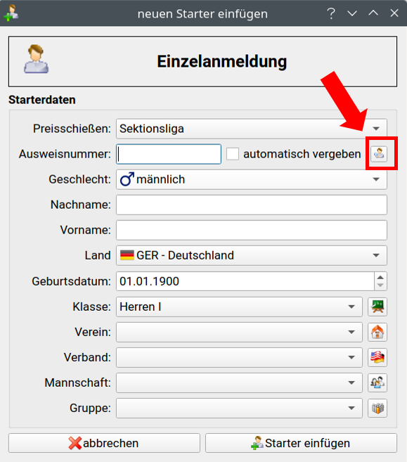 Die Daten werden automatisch in die Einzelanmeldung übernommen. Anschließend noch kurz kontrollieren, ob alle Daten in Ordnung sind. Wenn alle Daten richtig sind, kann der Schütze mit Starter einfügen in das Preisschießen eingefügt werden. Folgende Daten müssen eingetragen sein: