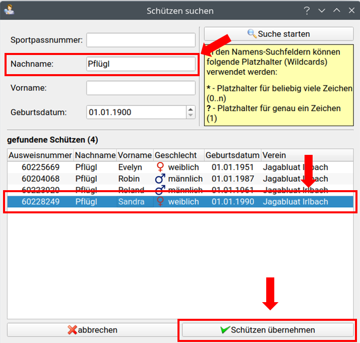Die meisten Schützen sind bereits in der Datenbank enthalten. Um den Schützen in der Datenbank zu suchen, muss auf den Button Schützen suchen geklickt werden. Es öffnet sich ein neues Suchfenster.
